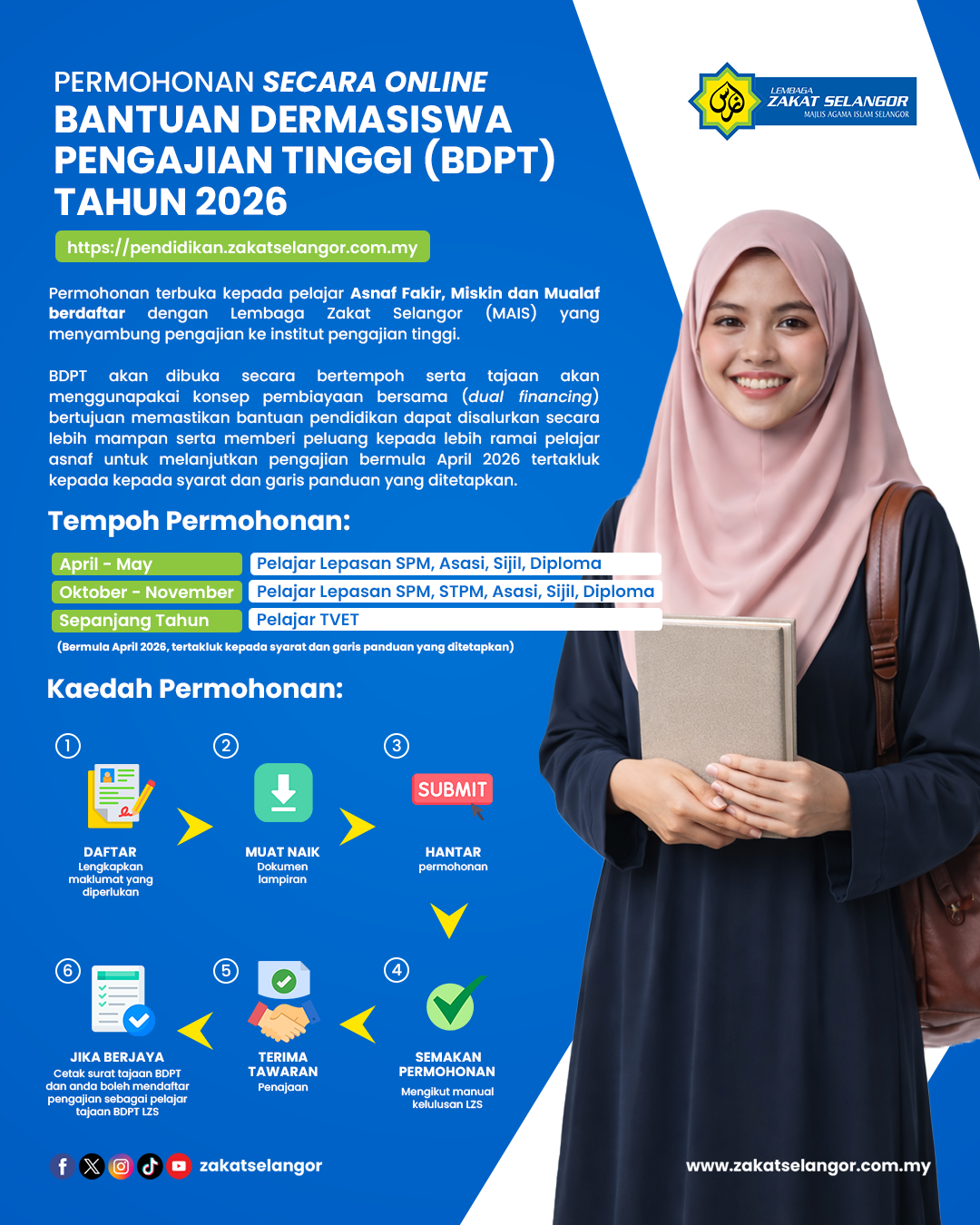 Bantuan BDPT hanya terbuka kepada pelajar yang memenuhi syarat tertentu yang telah ditetapkan oleh LZS. Berikut adalah kategori yang layak memohon: